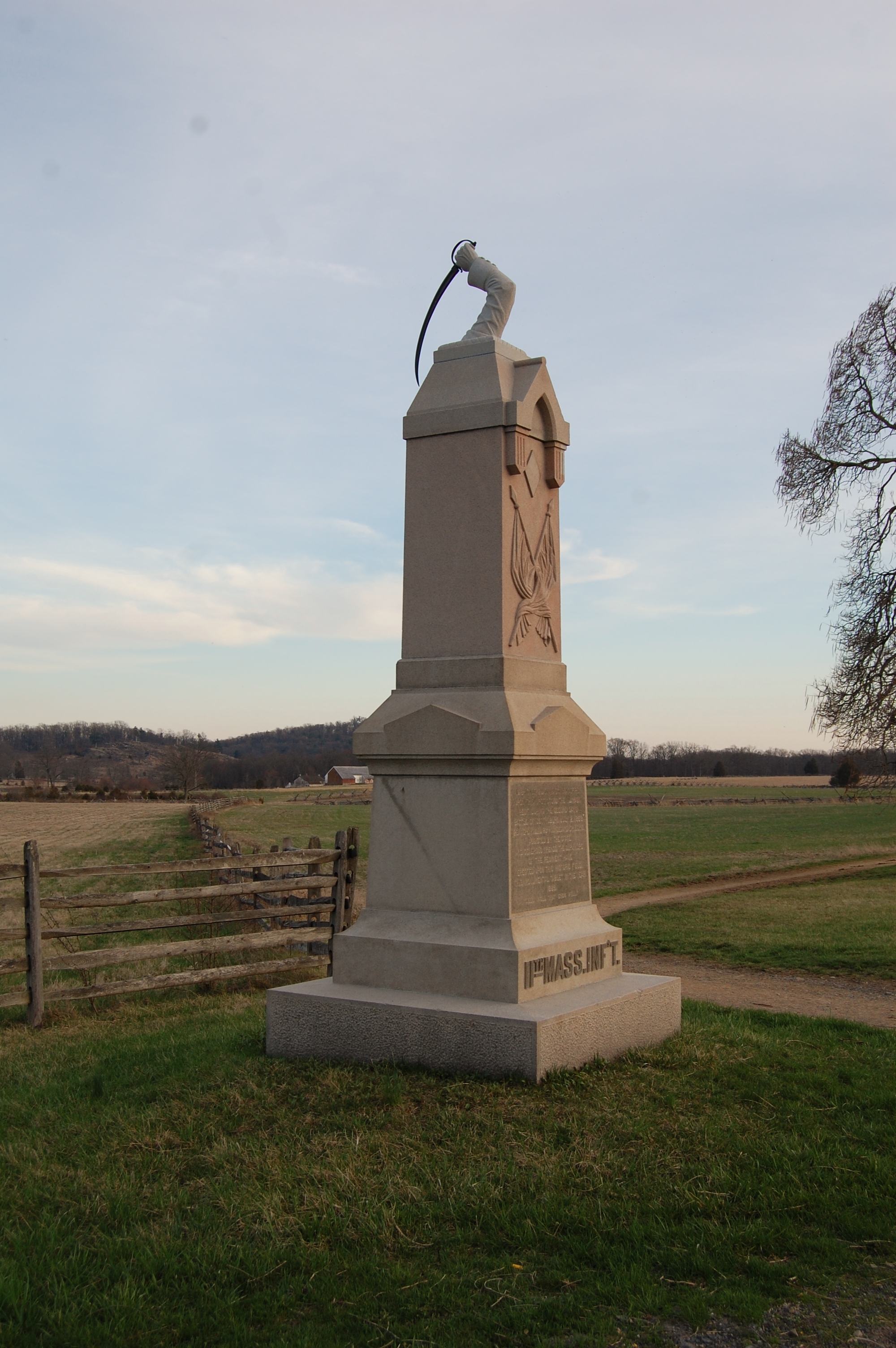 And on our way back into town along the Emmitsburg Road, we spotted the 11th Massachusetts Monument. This monument looks strange to most eyes, but the arm sprouting from the top was one of the key elements of the Massachusetts coat of arms, worn on the buttons of the state’s soldiers. The monument was vandalized in 2006 and painstakingly restored by the National Park Service.